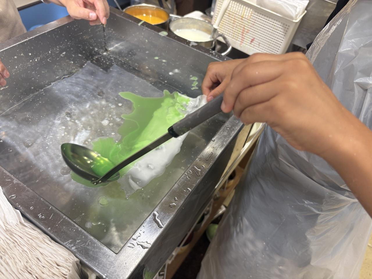 ロウを掬ってお湯の中にながしていきます。 -