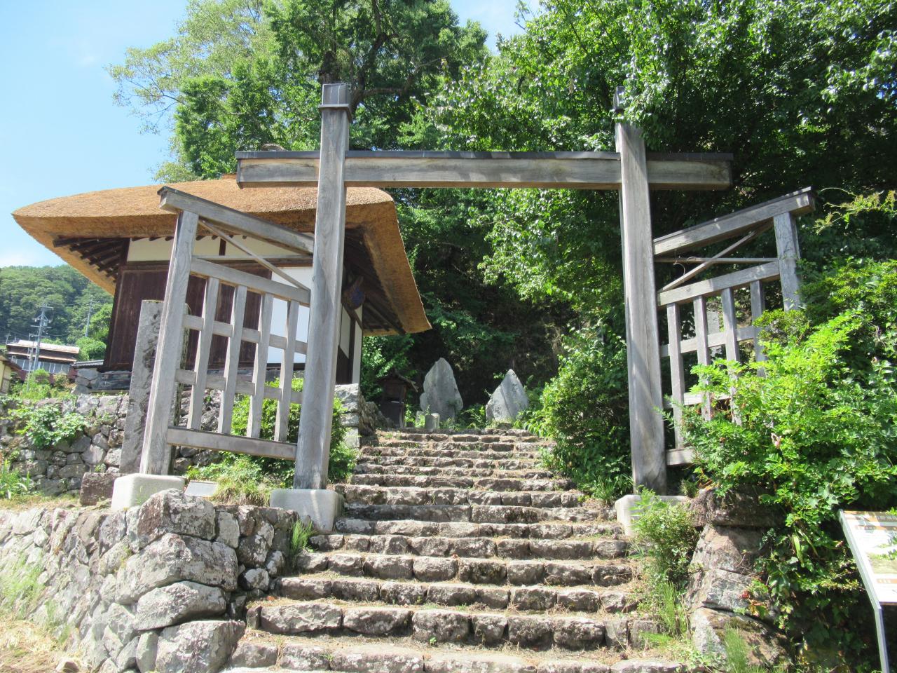 宿を出て、坂城町に向かいました。まず、坂城神社に行きました。一之鳥居から境内の二之鳥居まで約300mあります。山の麓に建つ神社で、境内に大木が茂っています。木造瓦屋根の拝殿の扉は開いていて、神殿が奥に見えました。