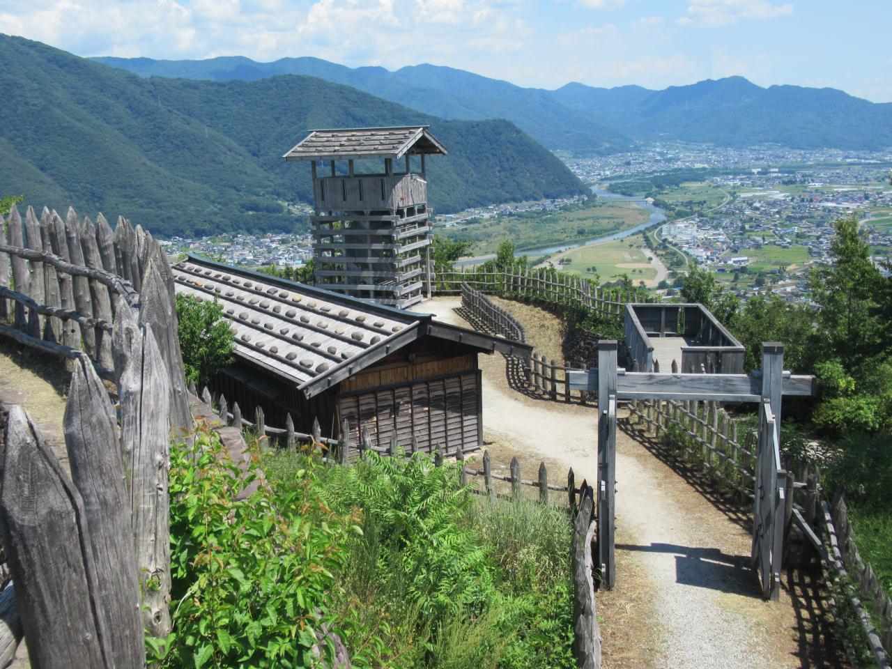 本郭に来ました。千曲川と戸倉上山田温泉の街並みや、遠くの上田市街地まで眺めることができました。城山史跡公園は、500年ほど前に築かれた荒砥城を再現しています。以前、公園として整備したころに訪れたました。当時は木の香りがする新しい建物でしたが、月日が経ち落ち着いた色になっていました。本郭から見た二の郭にある兵舎と櫓です。