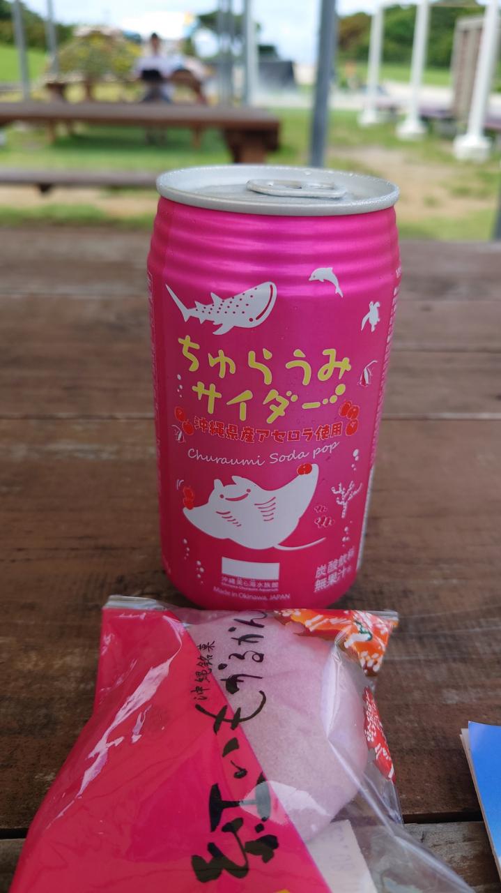 ちゅらうみサイダーと持ってきていた紅芋かるかんで沖縄ティータイム。