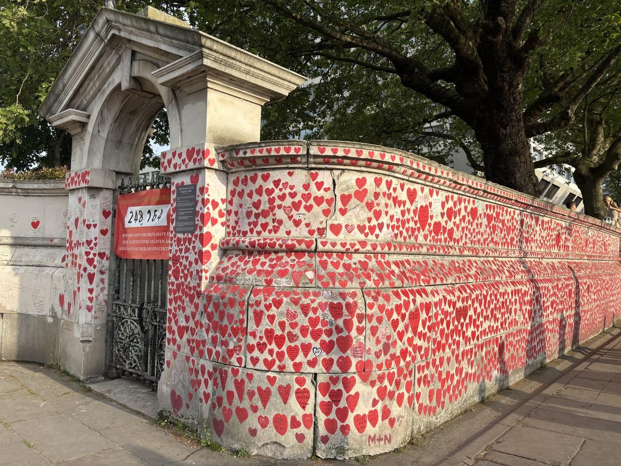 英国国立追悼壁『壁のハートはコロナで亡くなった人を表し追悼しています』と日本語で説明。