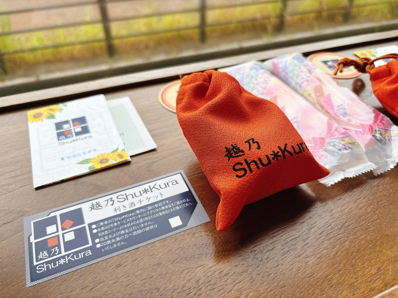 帰りの電車は巾着袋が違う色でした。(中に入っているおちょこは全部同じデザイン) -