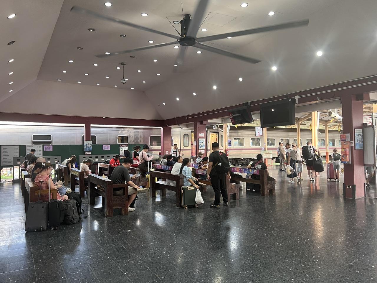 改札のないチェンマイ駅(バンコクも国鉄は全部かわからないけど、そうだね)。私はネットでギリギリ下段買えたけど、根気よく見てるとキャンセルもあるっぽい。この人は当日購入なのかな?次の利用日用に買いにきたのかな?