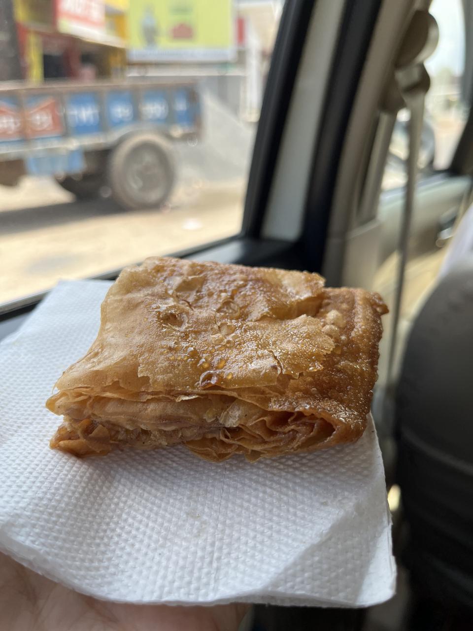 途中の街で、Khajaというお菓子が有名とのことでガイドが買ってきてくれました。