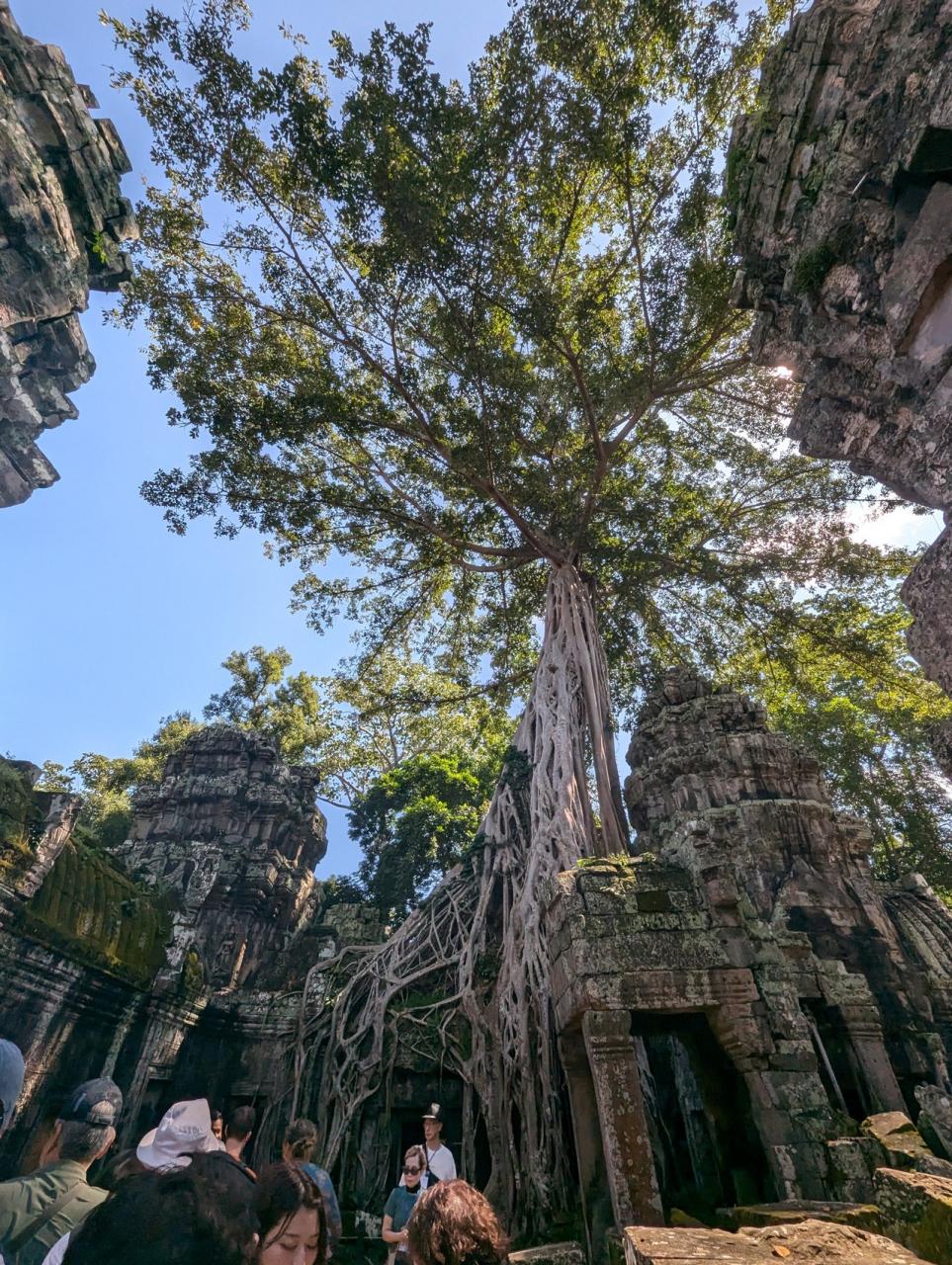 特に、巨大なガジュマルの木が寺院の建造物を覆い尽くすように絡みついているのが特徴です -