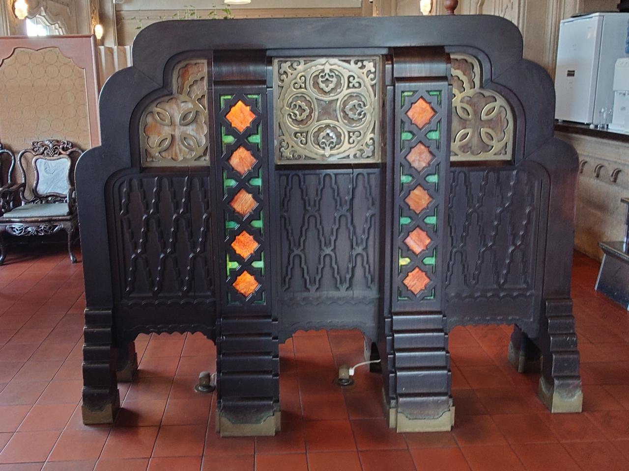 ヴォーリズ唯一のレストラン建築。随所に魚介類、野菜をモチーフにした装飾のあるスパニッシュ・バロック様式。日本最古のエレベーター設置。 -