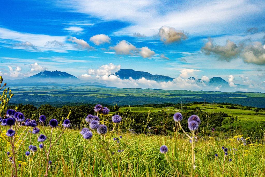 南に祖母傾、南西に阿蘇五岳を見渡す高原にヒゴタイの群生を見ることができます。