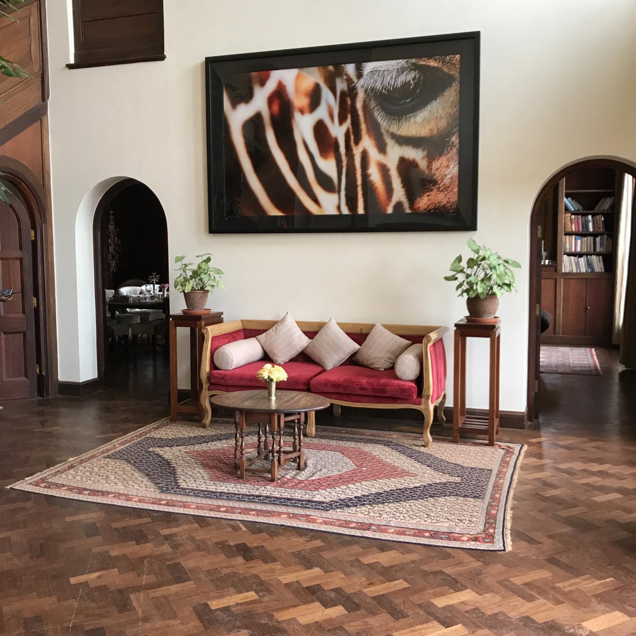 ガーデン マナーのラウンジ。ナイロビの標高は約1700mなので、日中はシャツ1枚で過ごせるけど、朝晩は冷える。暖炉のある客室もあります。