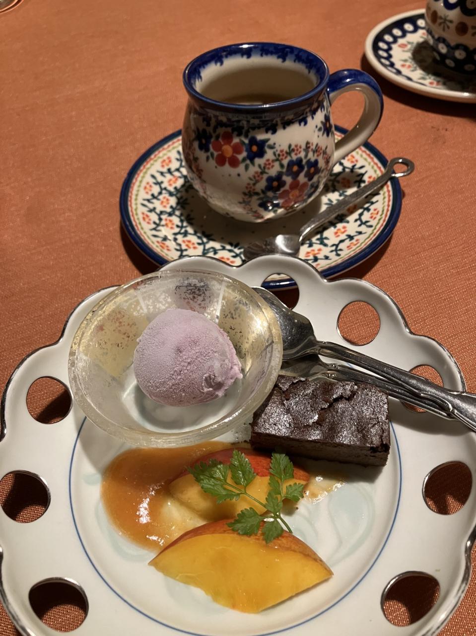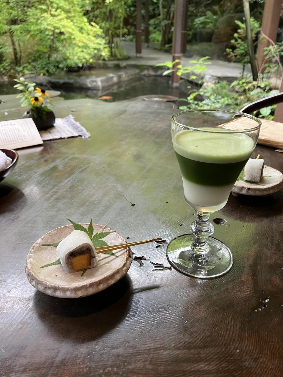 ラウンジでネクタリンとあんこの和菓子、抹茶と甘酒のウェルカムドリンクをいただきました