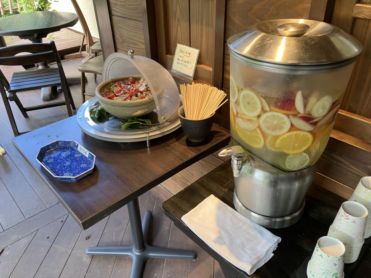 手前にデトックスウォーターとミニトマト&きゅうりのサービスがありました -