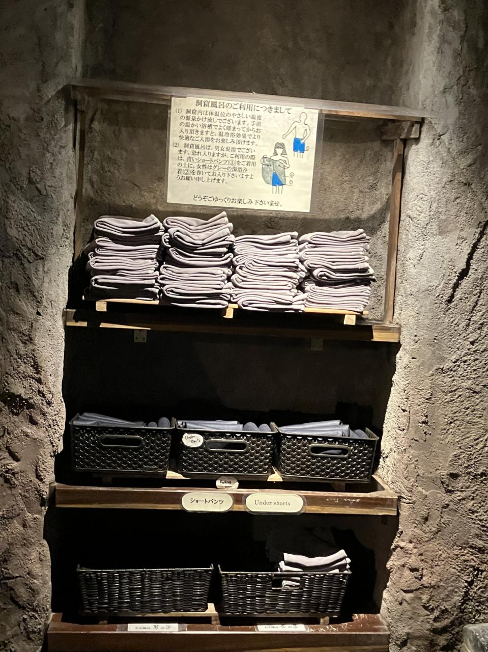 洞窟風呂は混浴の為、ショートパンツと湯あみ着を着用