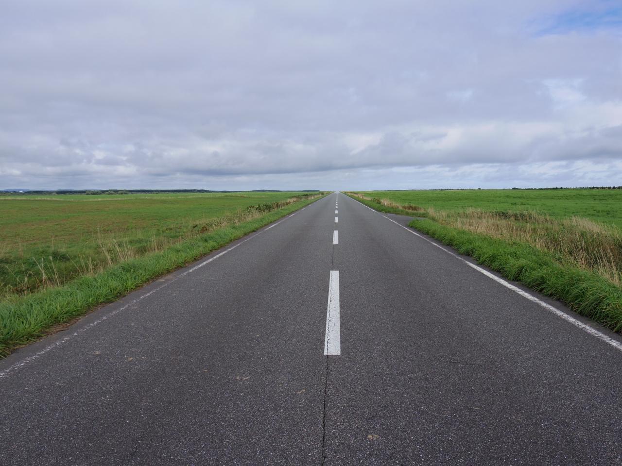 さて、次の目的地「宗谷岬」に向け走り出します。まず道北ハイライトのひとつ「農道浜猿払エサヌカ線」に来ました。標識もガードレールもない一直線の道が続きます。まさに北海道の光景です。