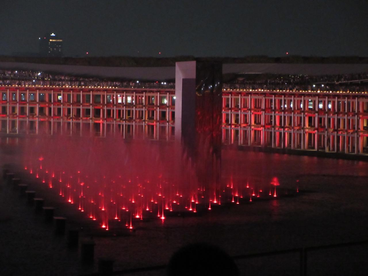 夜のショーをやってたウォータープラザと大屋根リング。