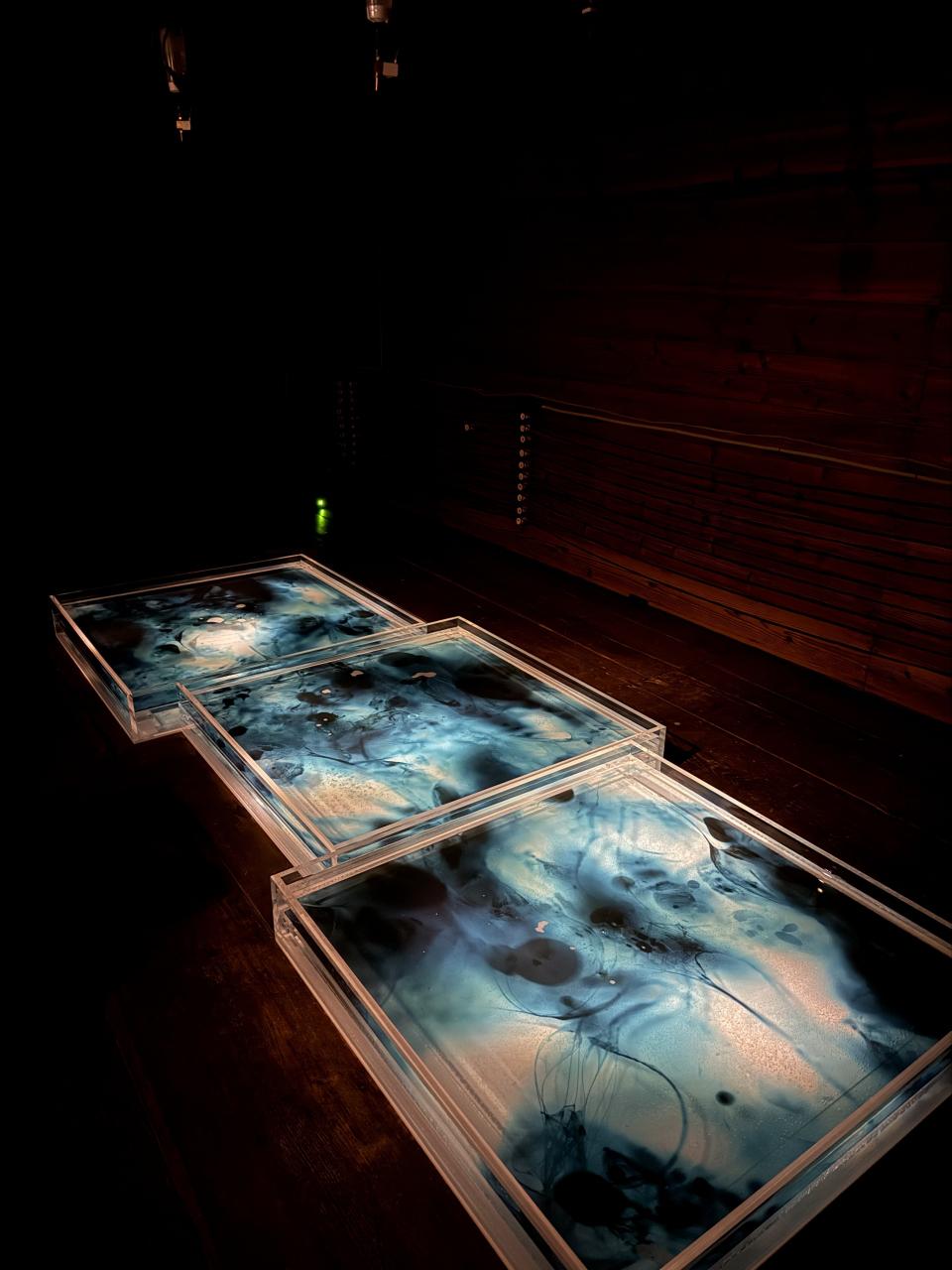暗い空間に浮かぶ白い網目状の彫刻作品がなんとも幻想的でした。