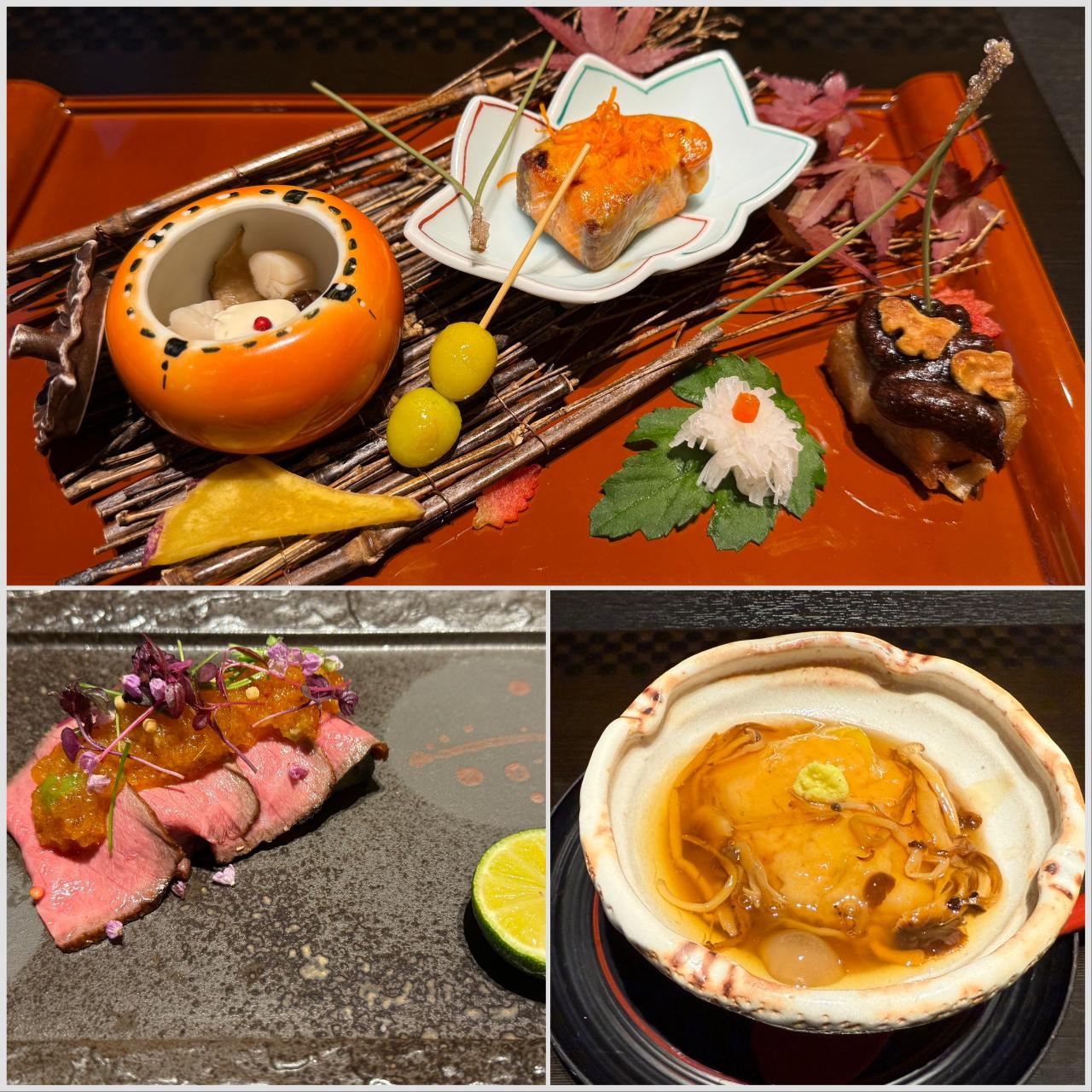 信州サーモン錦秋焼き、蓮根餅胡桃味噌田楽、銀杏串打ち