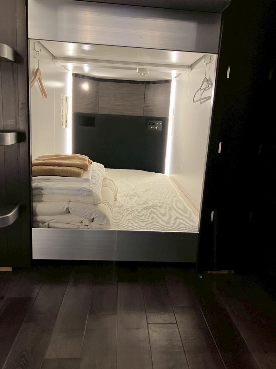 カプセル内は、コンセントに、USB、スマホ置き、ハンガー、空調ボタンもあり、照明は間接とスポット。