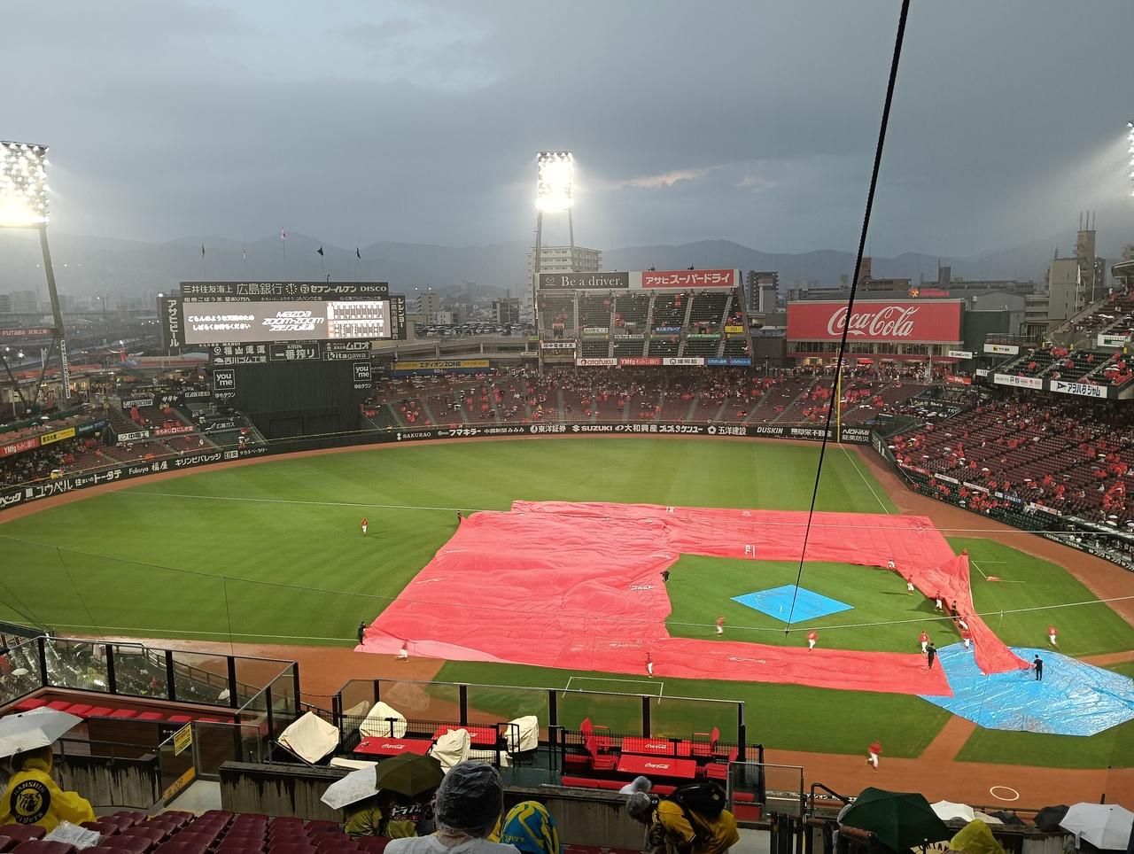 スタメンが発表され、国歌斉唱が始まろうとした途端突然の土砂降り((((;゚Д゚)))) 慌ててシートが被せられ、観客も屋根のある所に避難