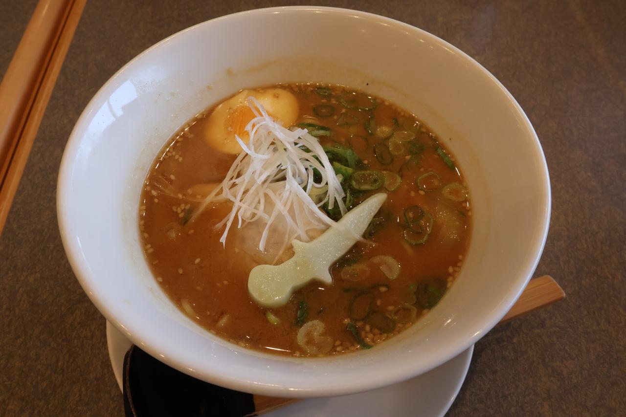 昼食は昨日利用した蕎麦屋の向かいのお店、「出雲の国 麺屋」さんです。味噌味で、剣形のかまぼこが入っています。 -