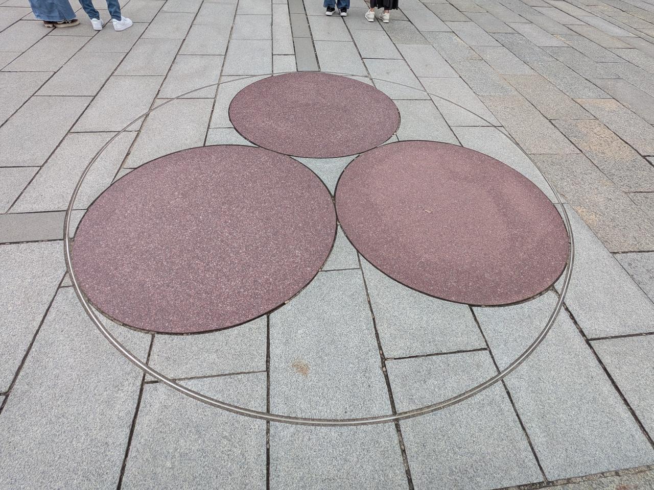 本殿前にある3つの赤丸は、かつての柱が出土した跡を示すものです。