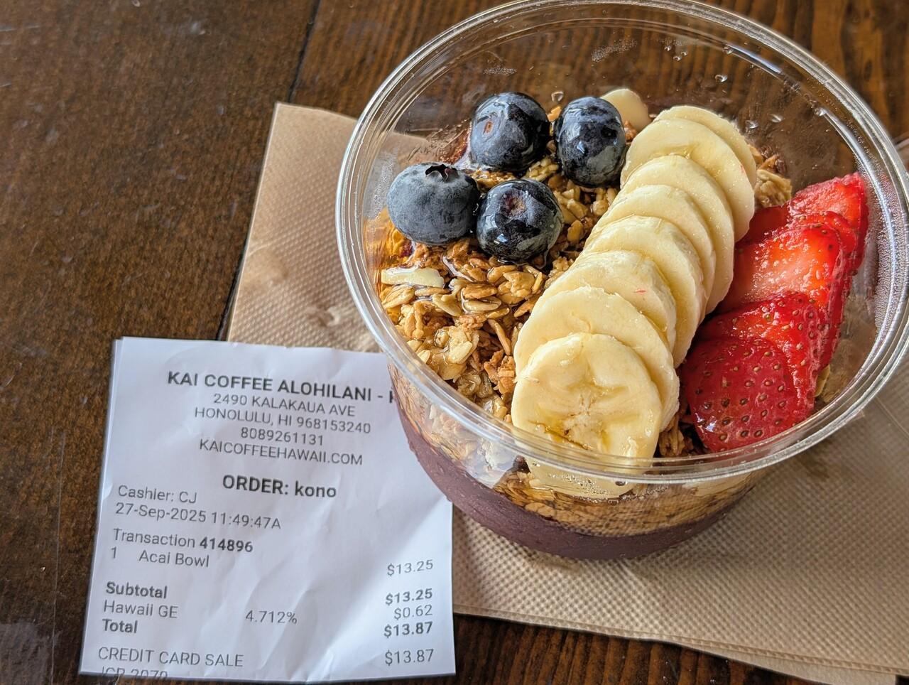 13.87ドル=2097円。カイ コーヒー ハワイ カフェ