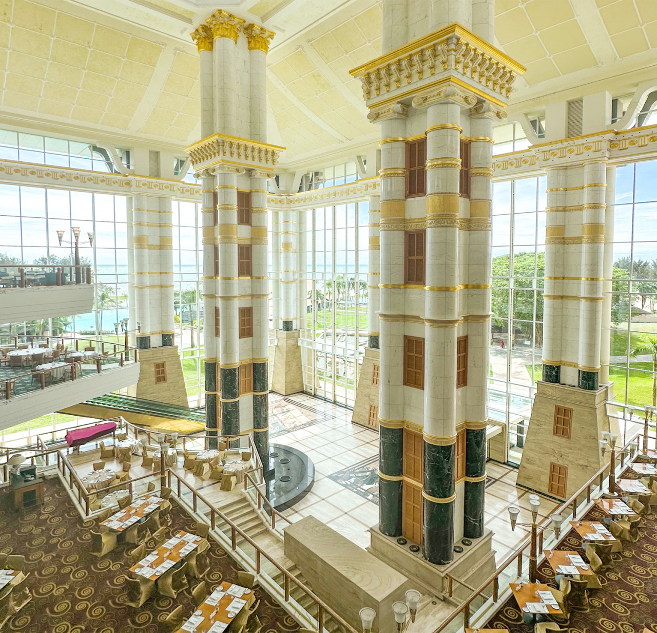 エンパイアホテルは柱や天井の高さも圧巻でしたが、上から見るテーブルの配置や数が忘れられません。訪れた方の記事が私の表示画像とみなさん同じ笑 このアングルほんと圧巻ですもんね