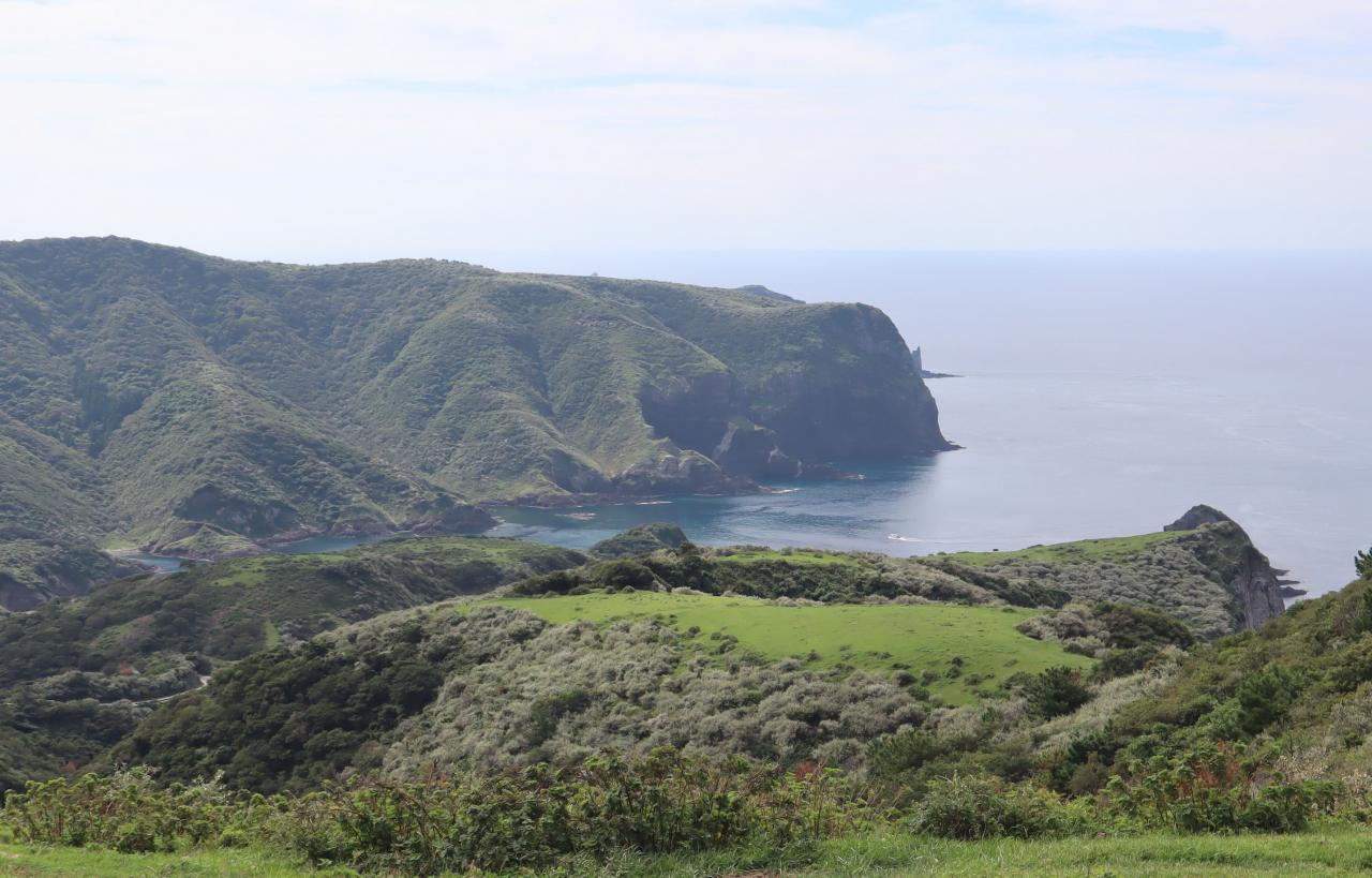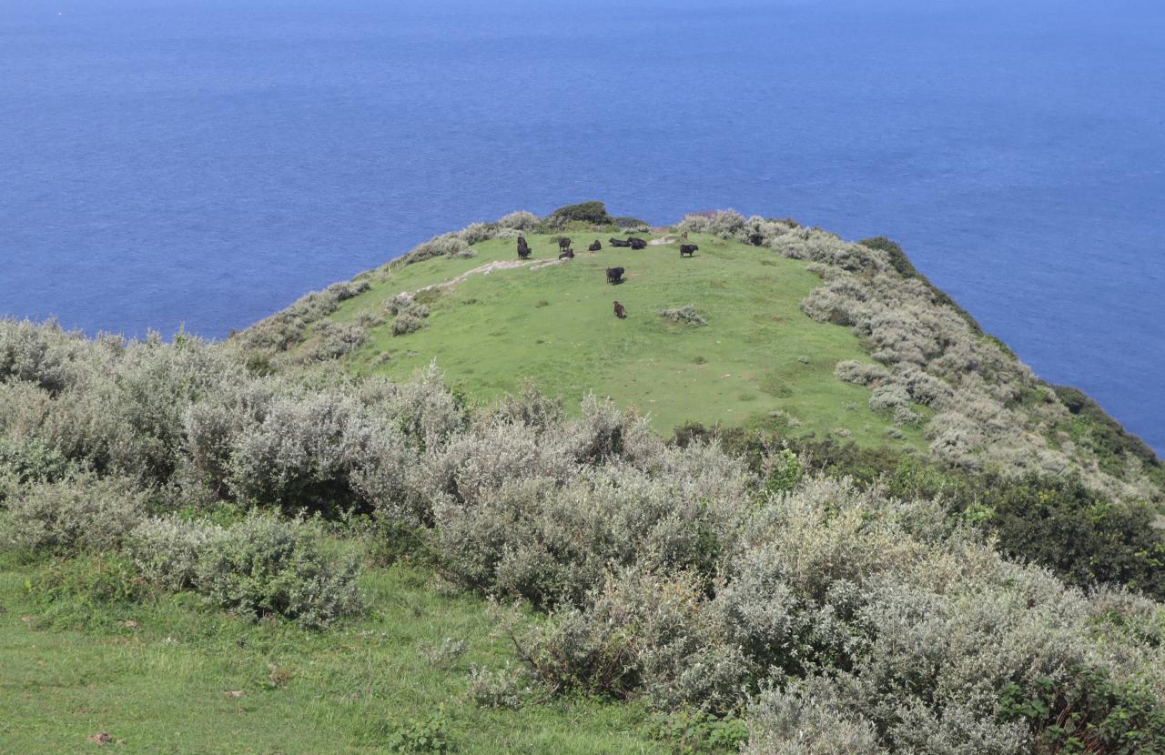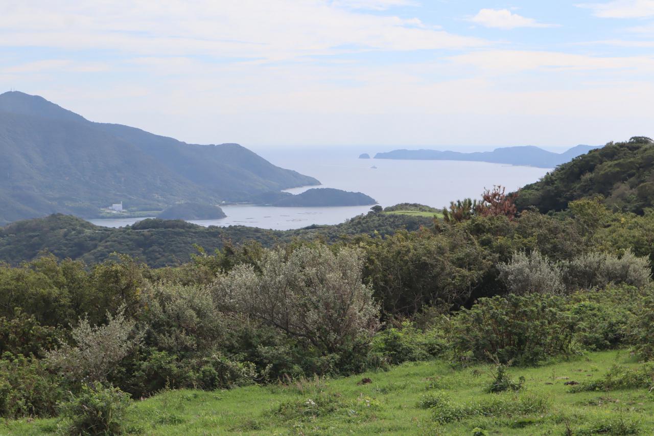 摩天崖の牧草地と右手が国賀海岸、左手が浦郷湾です。
