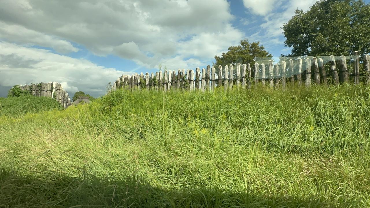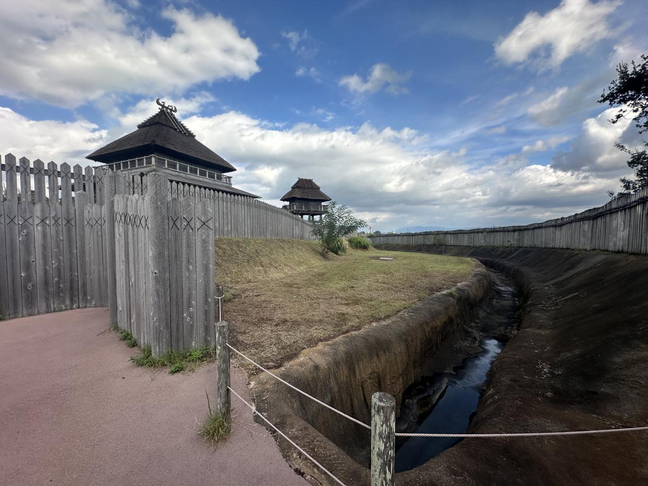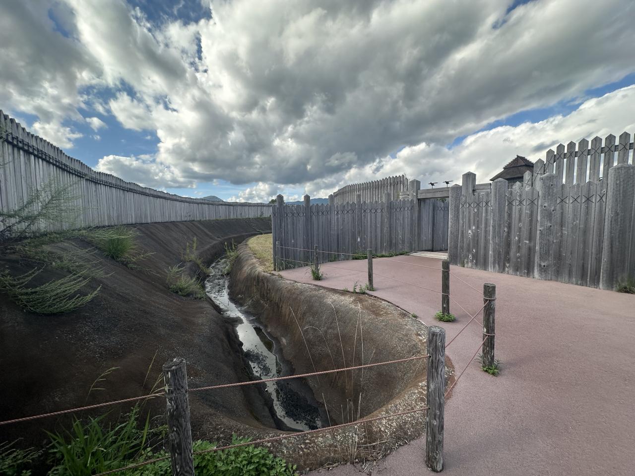 柵の内側にまた堀がめぐらされている。乗り越えても簡単には侵入させない構造。