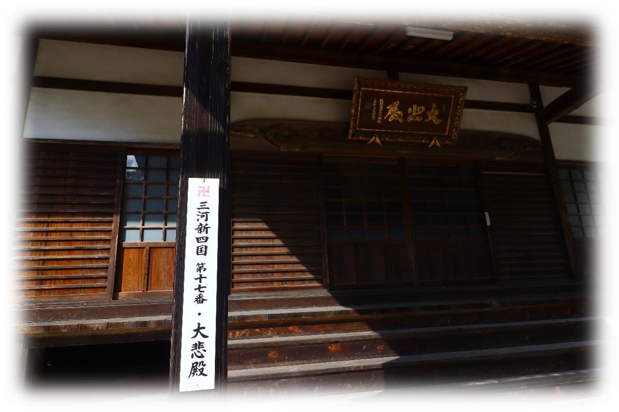 向拝柱に「三河新四国 第十七番・大悲殿」の木札と軒下の大悲殿の額。 -