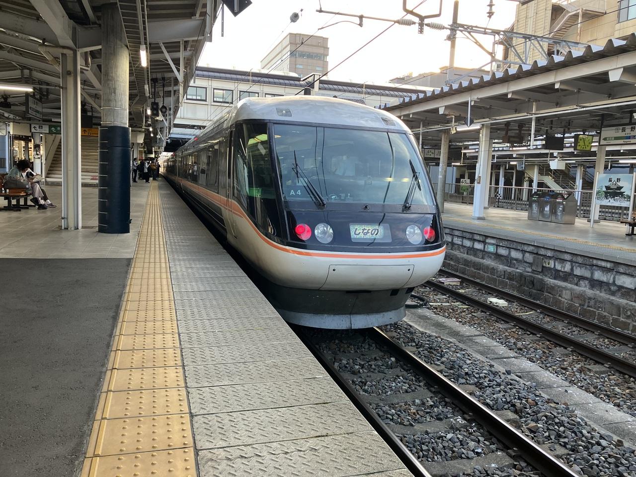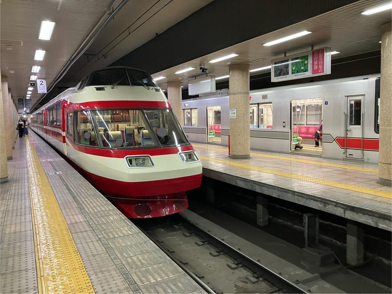 一部の方々のうちで伝説の「おとなげ席」のある車両です。先頭はパノラマ車両なので見晴らしがよく、先頭車だけ特急料金100円とは別に300円の指定席料金が必要。その中でもおとなげ席は最前列のことです。 -