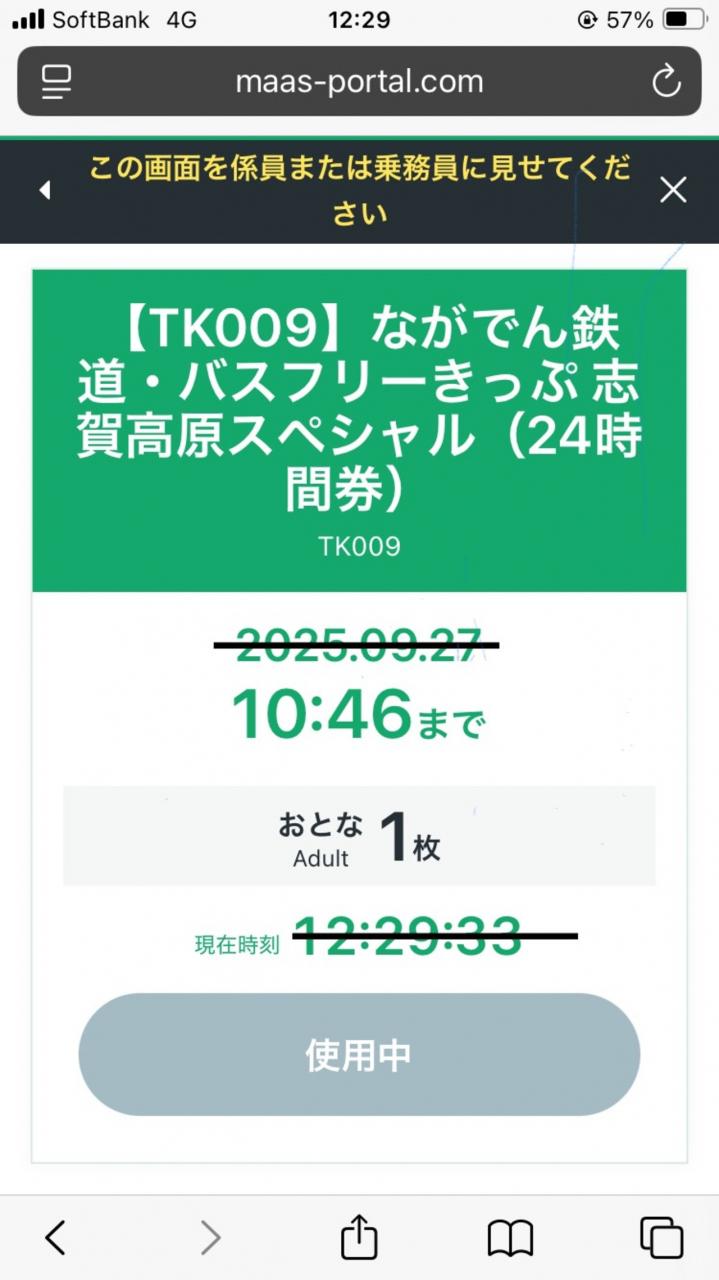 この日は電子チケットである「ながでん鉄道・バスフリーきっぷ志賀高原 スペシャル」を使用。なぜかJREのWebサイト「旅する北信濃」から買わないといけません。