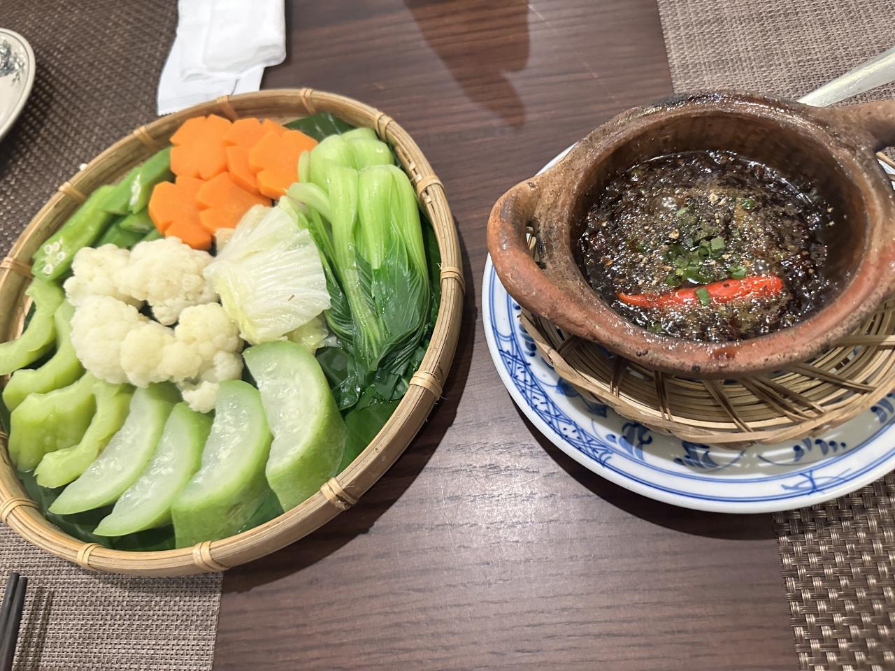 ゆでた野菜をいろいろ入ったピリ辛ソースで
