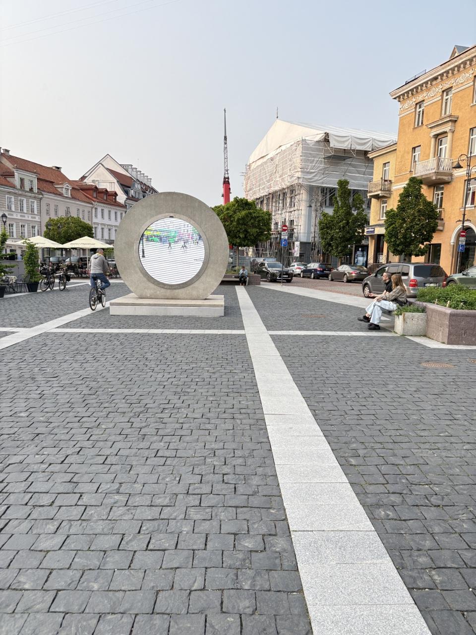 その前の市庁舎広場には丸いモニターや噴水がある。