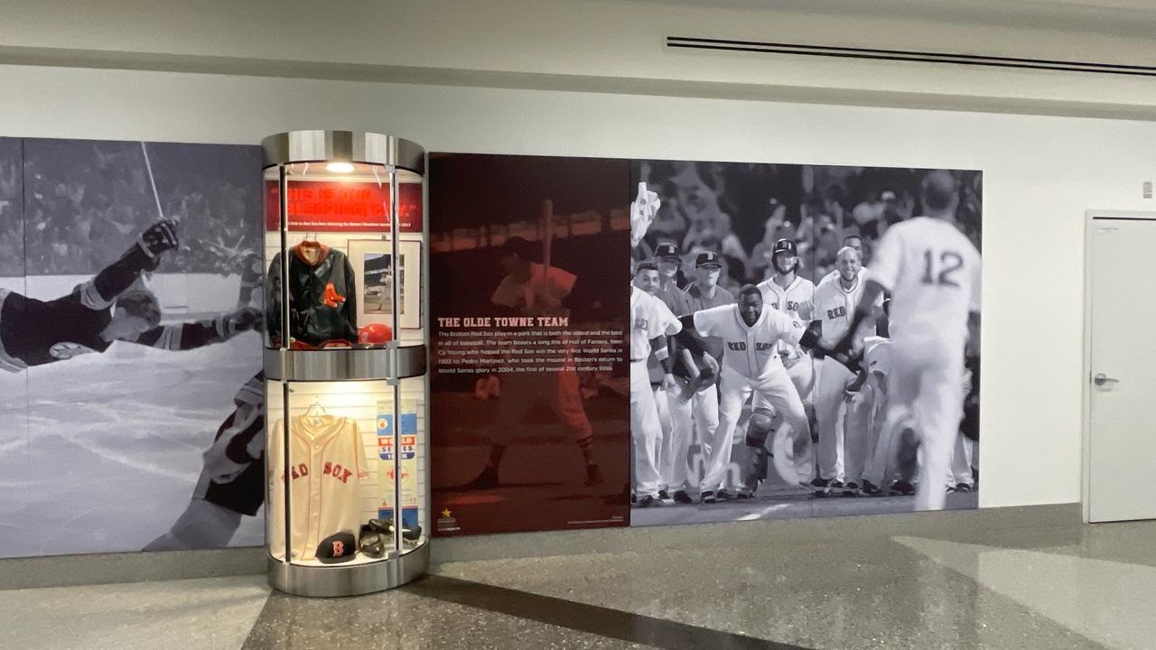 ボストンはスポーツの町、レッドソックスをはじめボストンを代表するスポーツチームの展示が通路の壁を飾る