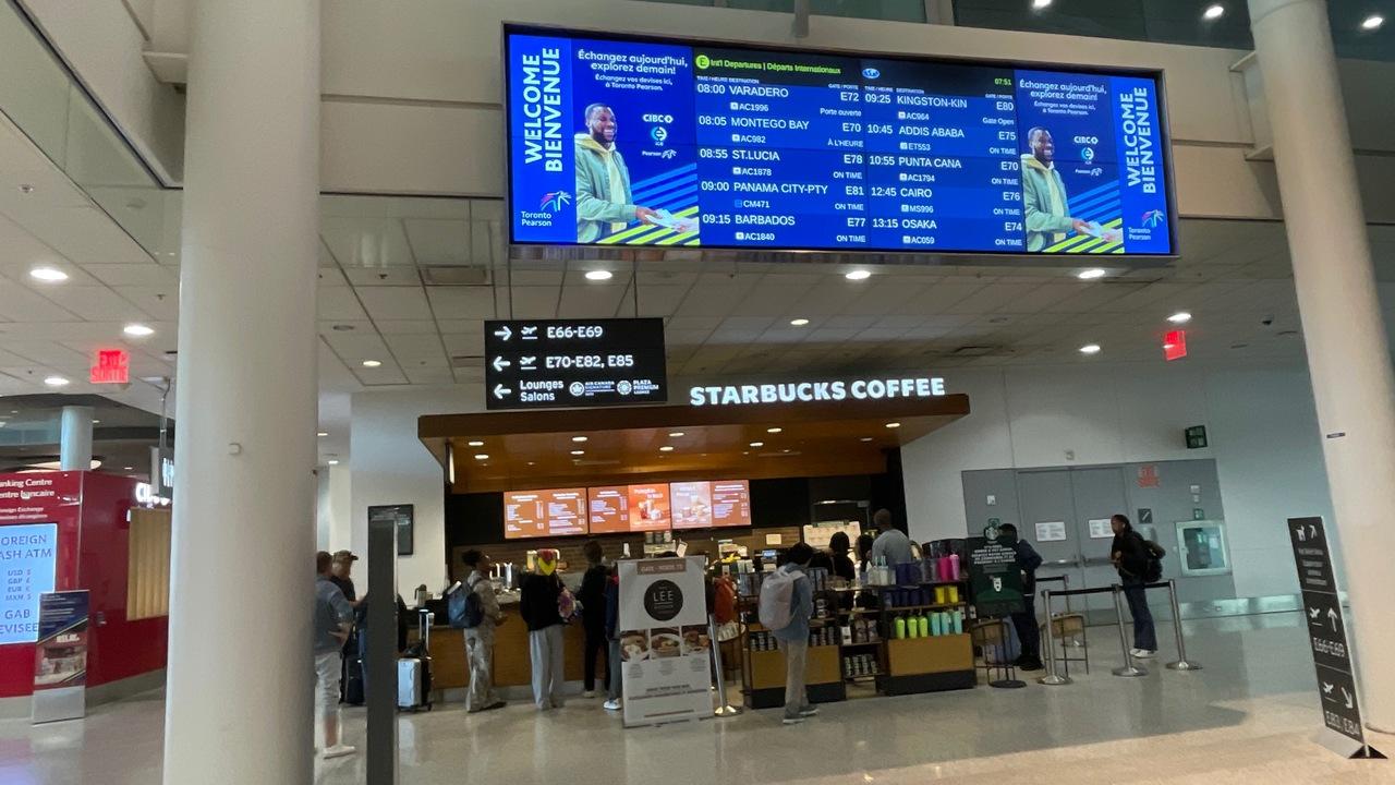 保安検査場から入った正面はネットカフェのような座席になっている。エアーカナダの待合スペースは狭く、売店もない。アメリカン航空側は広く、夜明け前にもかかわらず多くの乗客でごった返していた。売店といくつかのカフェは営業していて、ダンキンドーナツには行列がてきていた。が、とにかく高い。