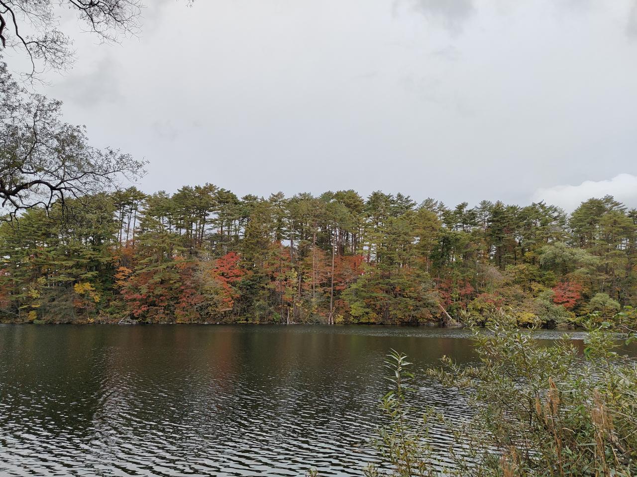 裏磐梯物産館の駐車場に車を置き、五色沼自然探勝路を歩きます。探勝路入口に「10/25夕方に熊出没」の情報が掲示されていたのですが、観光客の多い時間帯なので、自然に10人ほどのグループになっていました。(写真は駐車場からすぐの柳沼)