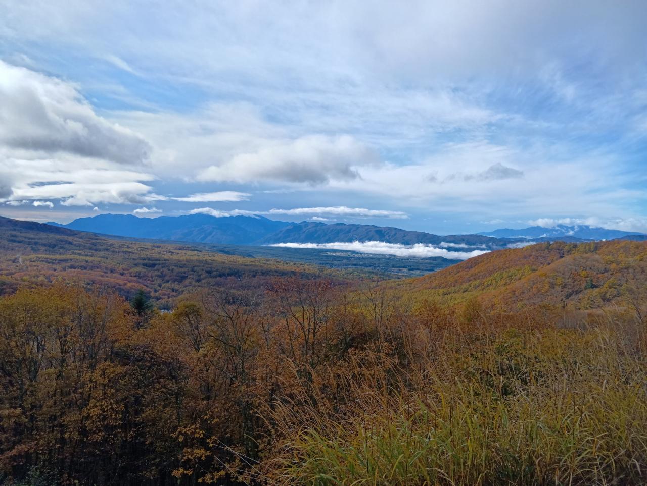 一部雲で山頂が隠れていますが、八ヶ岳が綺麗に見えます。木々も色づいています。