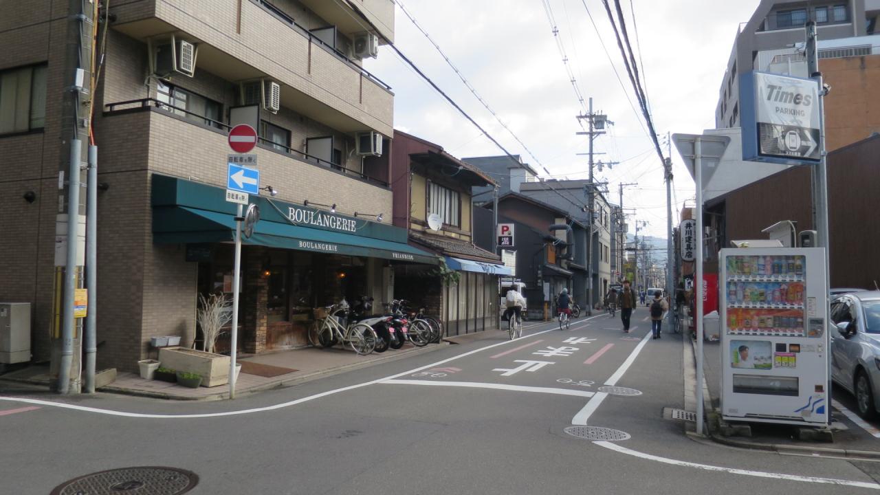 (姉小路通)突き当りは、2020年に「京都中央電話局」跡に出来たホテルで、左の壁は「御菓子司亀末廣」