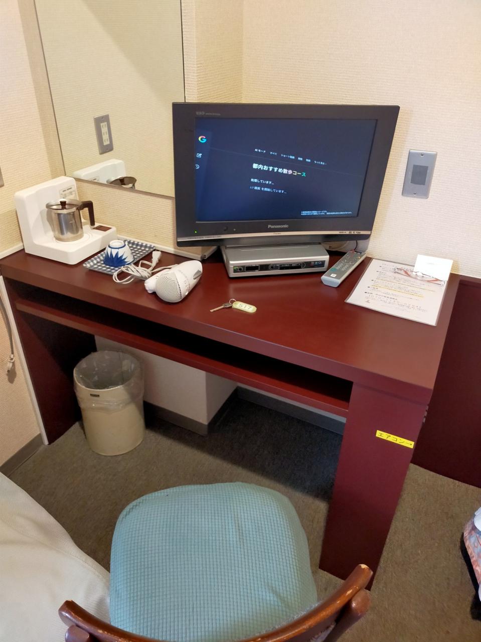 机もテレビも小さめですがお湯も沸かすことができるし、ドライヤーもありました
