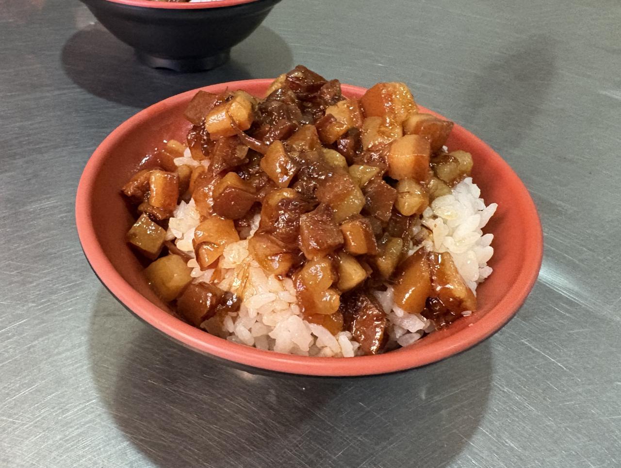 中華おこわの上にシイタケや小エビなどの煮物がのっています