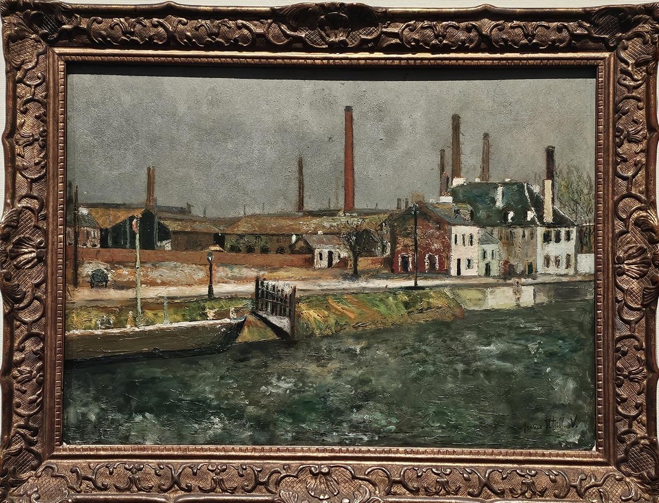エコール•ドパリの日本への紹介者として知られる福島繁太郎(1865-1960)によって1929年以前に日本へもたらされた作品。ブリヂストン美術館(現-アーティゾン美術館)を設立した石橋正二郎の絵画コレクションに最初期に加わった作品のひとつであり、今日のユトリロについての評価とは異なる文脈、すなわち印象派作品の収集の一環として購入された経緯が確認されている。パリ北東のラ•ヴィレットからはじまり郊外のサン=ドニへと至る運河を主題としたこの風景画は、1910年前後にはじまる「白の時代」の直前に制作された。均質化さ れた筆触の塗り重ねと運河、建築物、空がつくる層構造によって構築された風景は、カミーユ•ピサロ(1830- 1903)の影響のもとにあったことを伝えている。 -
