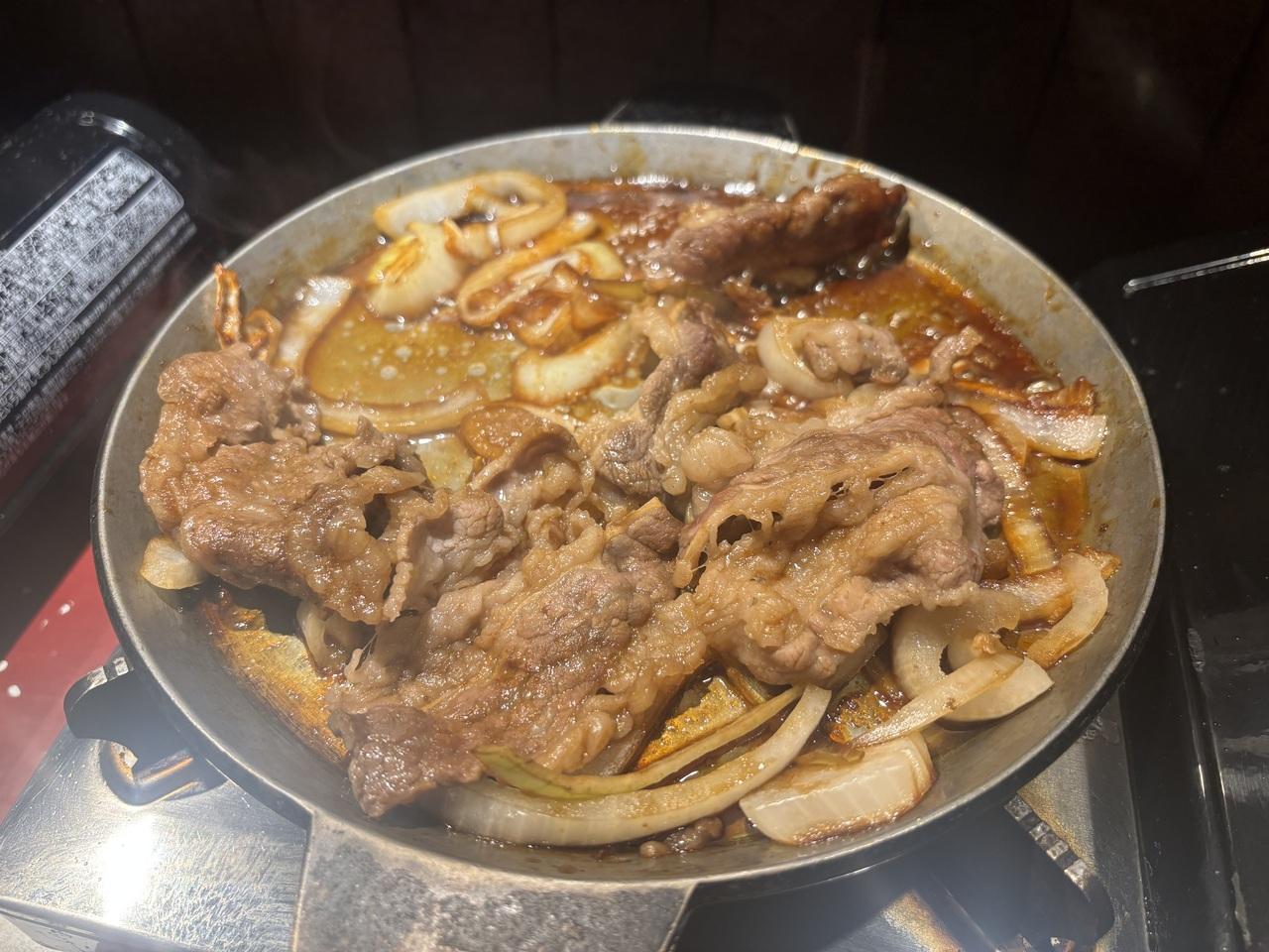 牛と豚肉を注文。割り下浸かった玉ねぎの上に肉が乗っている司バラ焼き大衆食堂 グルメ・レストラン
