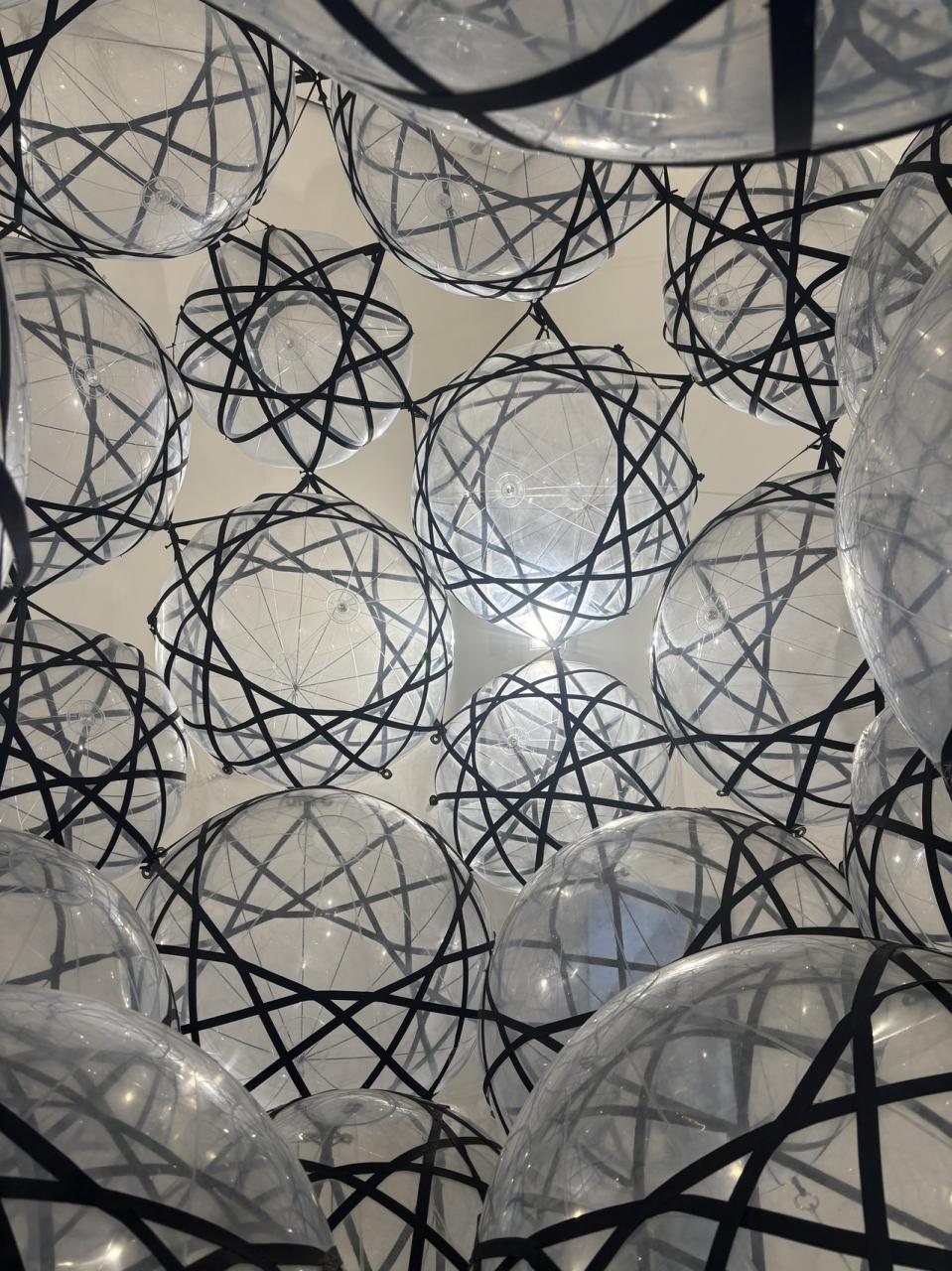 空中に浮いた多くのバルーンが連なっていて、床や天井からのひもでつながっている -