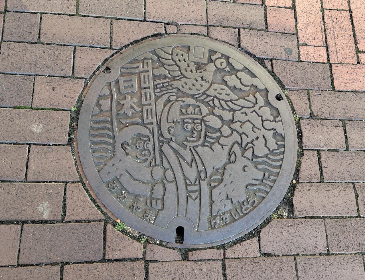 朝、岡山駅に行く途中で桃太郎のマンホール蓋発見。