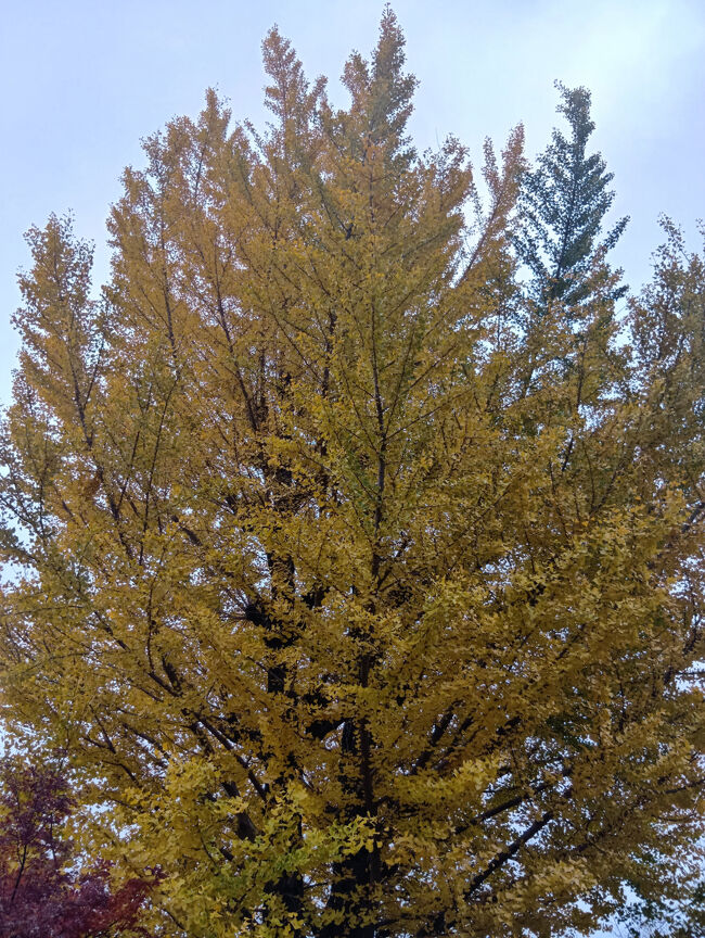 一部黄緑色が混ざっているイチョウ。周囲の真っ赤な紅葉、そして壮大で艶やかなイチョウとのコラボはまさに絶品です!