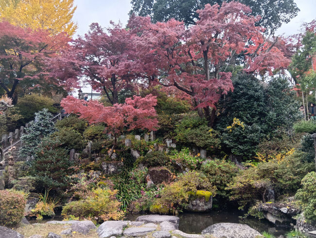 多くが散ってしまっているイチョウと赤色の紅葉および寺社などのコラボ、まるで絵葉書にも使われるような美しい光景です!