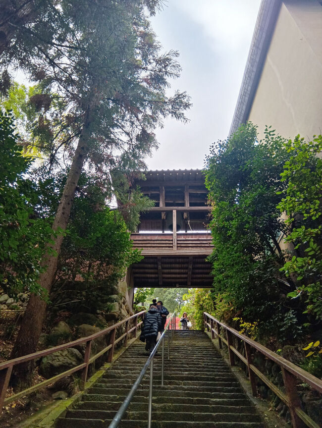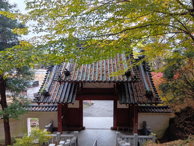 下って行くと途中から門と紅葉が見られます。門は総門でこの急な長い階段が参道のようです。