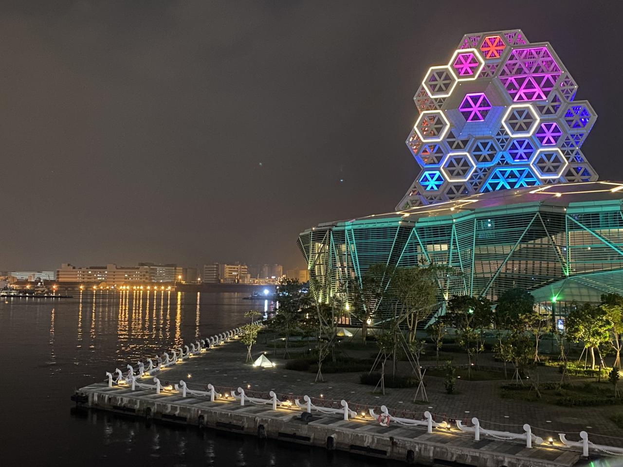 高雄流行音楽中心を間近で見ると、奇抜な外観と頻繁に変わるライトアップに圧倒されるばかり。