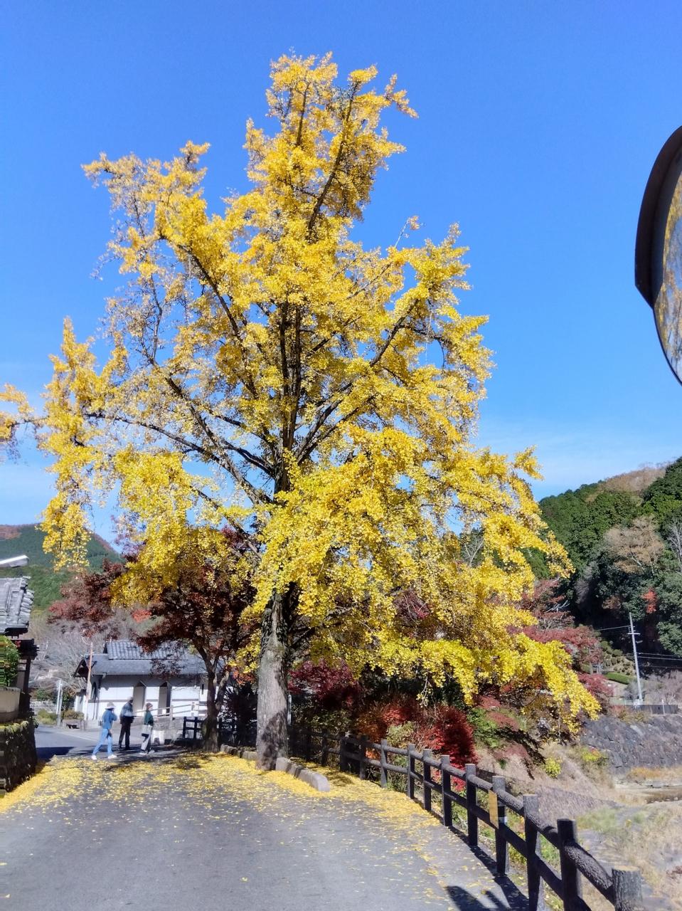そして麿崖仏の対岸にある大野寺の前に立つ黄金色に色付いた大きなイチョウの木から銀杏がばら撒かれて特有の臭いも漂っています。