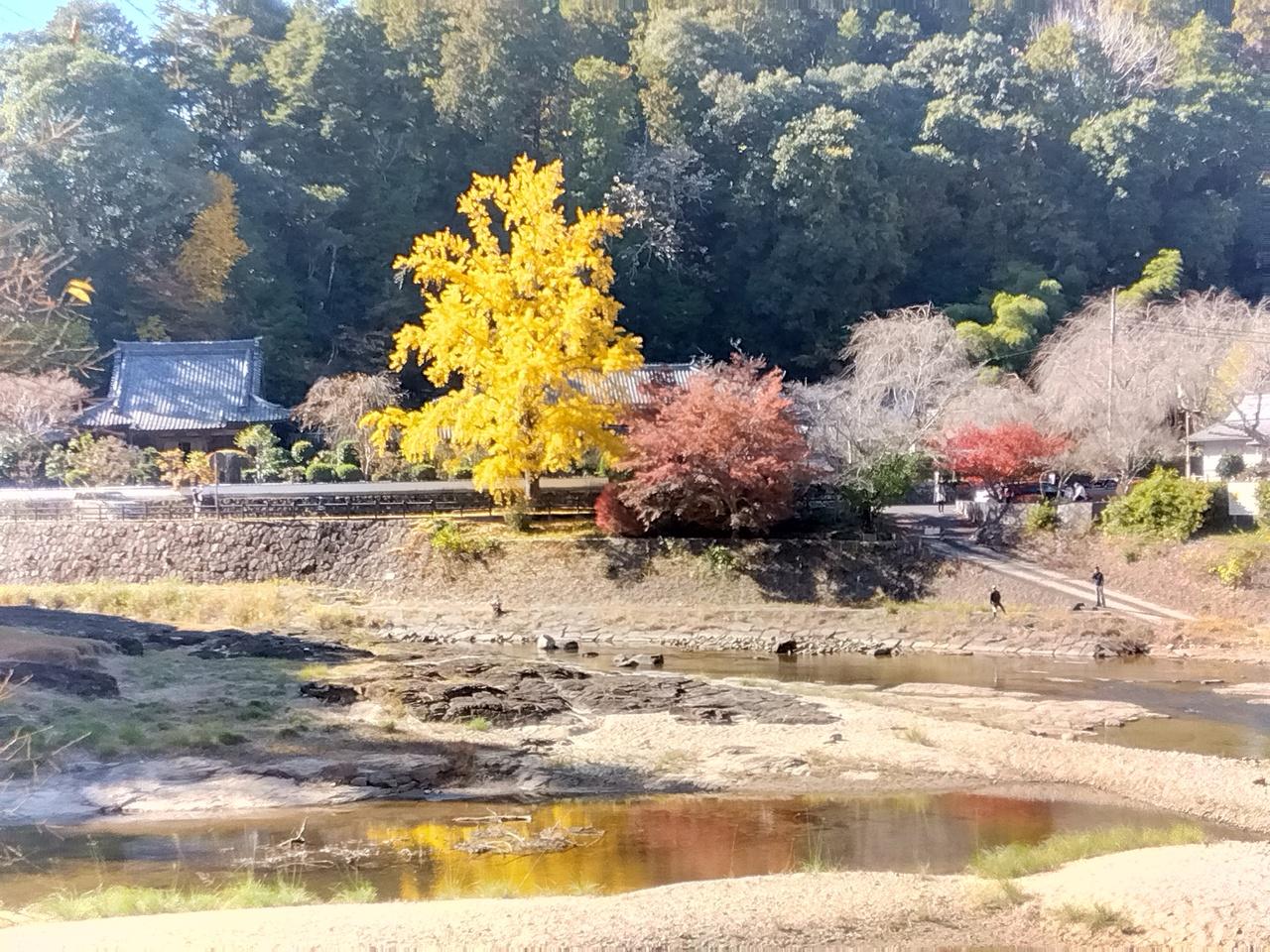 こちら側からもと来た大野寺を振り返ると、川の向こうに大野寺の屋根、黄金の大イチョウ、赤く色付いた楓が並ぶ良い眺めです。
