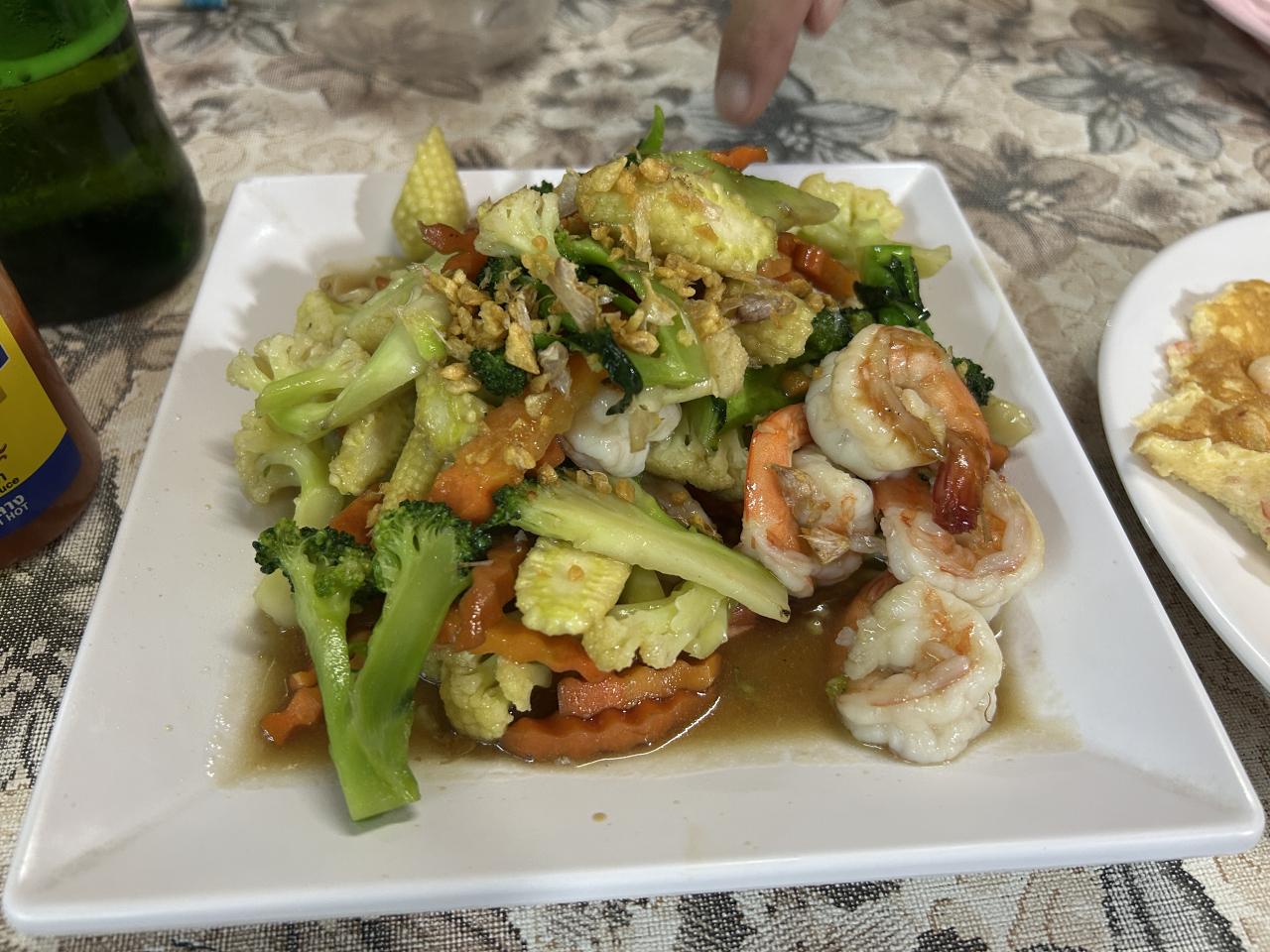 この日のゴルフの打ち上げは、いつものチャーリーの店でした、仲間が店の前の交差点で停止中にバイクをピックアップトラックに引掛けられて、一騒動ありましたが、保険屋さんが来て一件落着ケガもなかったので良かったです。【写真】エビと野菜炒め -